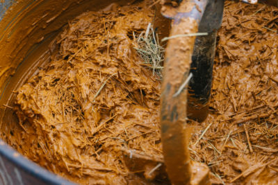 粘土質の土と水と、刻んだ藁を混ぜて土壁の材料をつくる