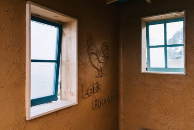 土壁作りの仕上げにLFCロゴを彫刻して、ホテルのトイレのようにラグジュアリーなコンポストトイレが完成しました。