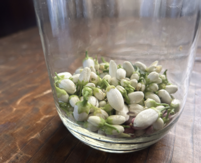 たわわについた蕾のなかには開花の前に落下するものもあり、蕾を無駄にしないためにも、酵素シロップ用に毎日集めています。柑橘類の白く可憐な花は、ネロリのような甘い香りでスタッフのお気に入り。他にもハーブや、ジャスミンやバラの蕾、5月後半に旬を迎える梅で作っても美味しいです。