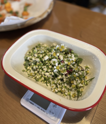 ①野草やハーブを摘んで、水洗いし、水気をよく切る