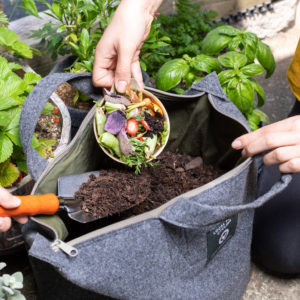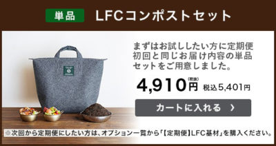 家庭の生ごみを減らし、美味しい野菜をつくるための堆肥(土)を作ってくれるコンポスト。「LFCコンポストセット」は生ごみの分解を速め、悪臭の発生を抑える独自の配合基材(生ごみと混ぜ合わせる原料)や水や虫の侵入を防ぐ特注のファスナーなど、初めての方から慣れた方まで続けやすい工夫を各所に施しています。1日400gの生ごみを1.5ヶ月~2か月間投入することができ、その後2、3週間ほどで栄養価の高い堆肥へと変わります。堆肥ができたらベランダで家庭菜園をつくってみませんか。LFC専用バッグは再利用できます。特許出願中。