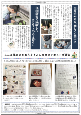 - コンポストは生ごみもゼロにできるし、臭いもないし、堆肥も作れるし、ビニール袋も買わなくて良いし、いいことだらけ!次は、堆肥を利用して、野菜作りの実験も続ける予定です。(みっしーさん、小5)